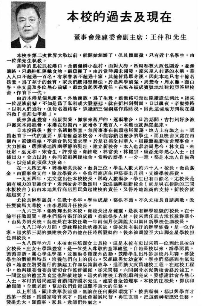 由于本港是个鱼产区,外地贩商为了生意,虽无路可走但也陆续设法到此。后来一位巫裔前辈,不知是为了私立还是大发慈悲,就在新村斜对面,日以继夜,辛勤筑路,以利人们通行。但每名过路客,须缴纳3个铜镭作为路税。因此这个地方也被叫作“担茫知甲镭”。 后来鱼产丰富,商贩云集,搬家来落户的逐渐增加,日治期间,吉打州许多渔户搬来本港经营,以致本港在短期内增多了数百人,本港也就热闹起来了。日本投降后,数十名适龄学童无所事事在街头巷尾闯荡,地方上有识之士,认为教育下一代的重要性,而原有旧亚答校舍已无法再容纳这么多学生,而且校舍又处在市镇内,纷扰喧哗,不适合供儿童求学。于是召集全村华人,组织筹建新校舍理事会大力推动,选择场地宁静清幽的现址建立新校舍。当时王仲和、周懋令、林文扁、朱旺财、巫元和、宋奇生、许秀慈、郑维乾、林常美、林耀宗、康添光等热心人士,出钱出力,合力以赴,共同策划兴建校舍。当时的办学,一分一毫都是本地人自掏腰包,以完成此项伟大的使命。